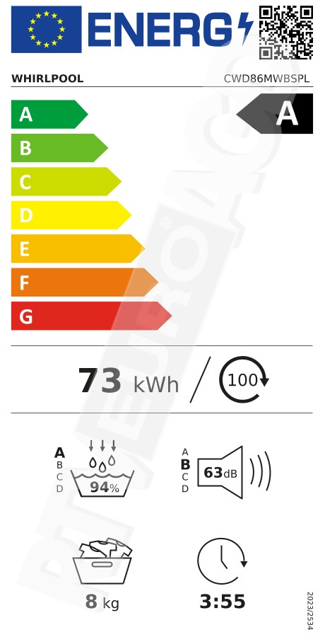 Zużycie prądu (100 cykli): 47 kWh = 48,41 zł