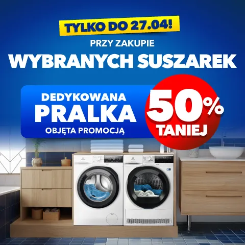 „Przy zakupie wybranych suszarek, dedykowana pralka objęta promocją 50% taniej” obowiązuje w sklepach RTV EURO AGD oraz na euro.com.pl (z wyłączeniem outletów) od: 07.04.2026 r. od godz. 09:00 do 27.04.2026 r. do godz. 23.45 lub do wcześniejszego wyczerpania się asortymentu. Obejmuje wybrane pralki i wybrane suszarki. Klient przy zakupie suszarki może nabyć odpowiadającą jej pralkę z 50% rabatem. Szczegóły promocji, w tym zasady jej łączenia się z innymi promocjami, w Regulaminie w sklepach i na euro.com.pl. Zapoznaj się z regulaminem.