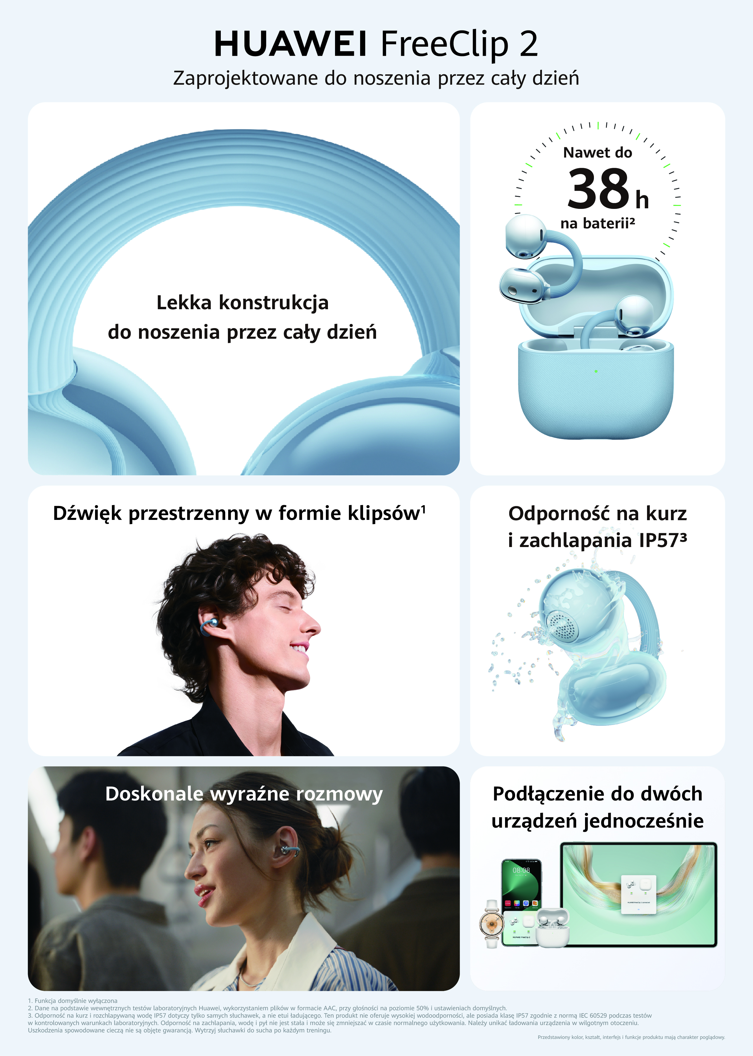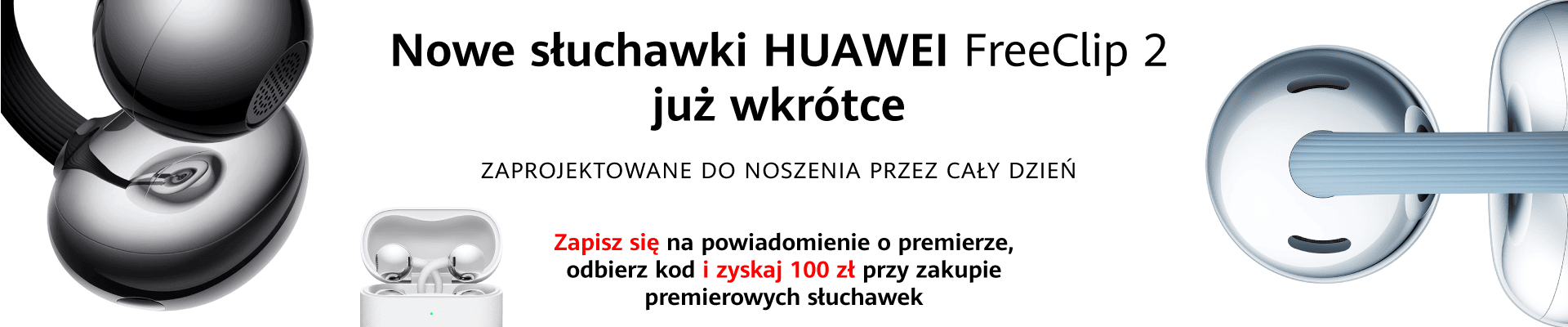 Kod dedykowany uprawniający do nabycia produktu premierowego w cenie dla osób zapisanych na powiadomienie zostanie udostępniony na adres e-mail podany w zgłoszeniu w terminie do dnia 22.01.2026 r. do godz. 12:00. Zgłoszenie możliwe jest do dnia 21.01.2026 r. do godz. 23:59. Kod umożliwia nabycie premierowych słuchawek Huawei FreeClip 2 w cenie o 100 zł niższej. Lista produktów premierowych możliwych do zakupu w cenie z kodem pojawi się w dniu premiery pod adresem wskazanym w wiadomości wysłanej na adres e-mail podany w zgłoszeniu. Kod ważny jest od dnia 22.01.2026 r. od godz. 9:00 do 08.03.2026 r. do godz. 23:45 lub do wyczerpania się asortymentu w sklepach RTV EURO AGD i na euro.com.pl (z wyłączeniem outletów). Kodu można użyć tylko 1 raz, ale w ramach jednej transakcji może być użyty na więcej niż 1 produkt. Dedykowane kody rabatowe nie łączą się. Szczegóły w sklepach i na euro.com.pl.