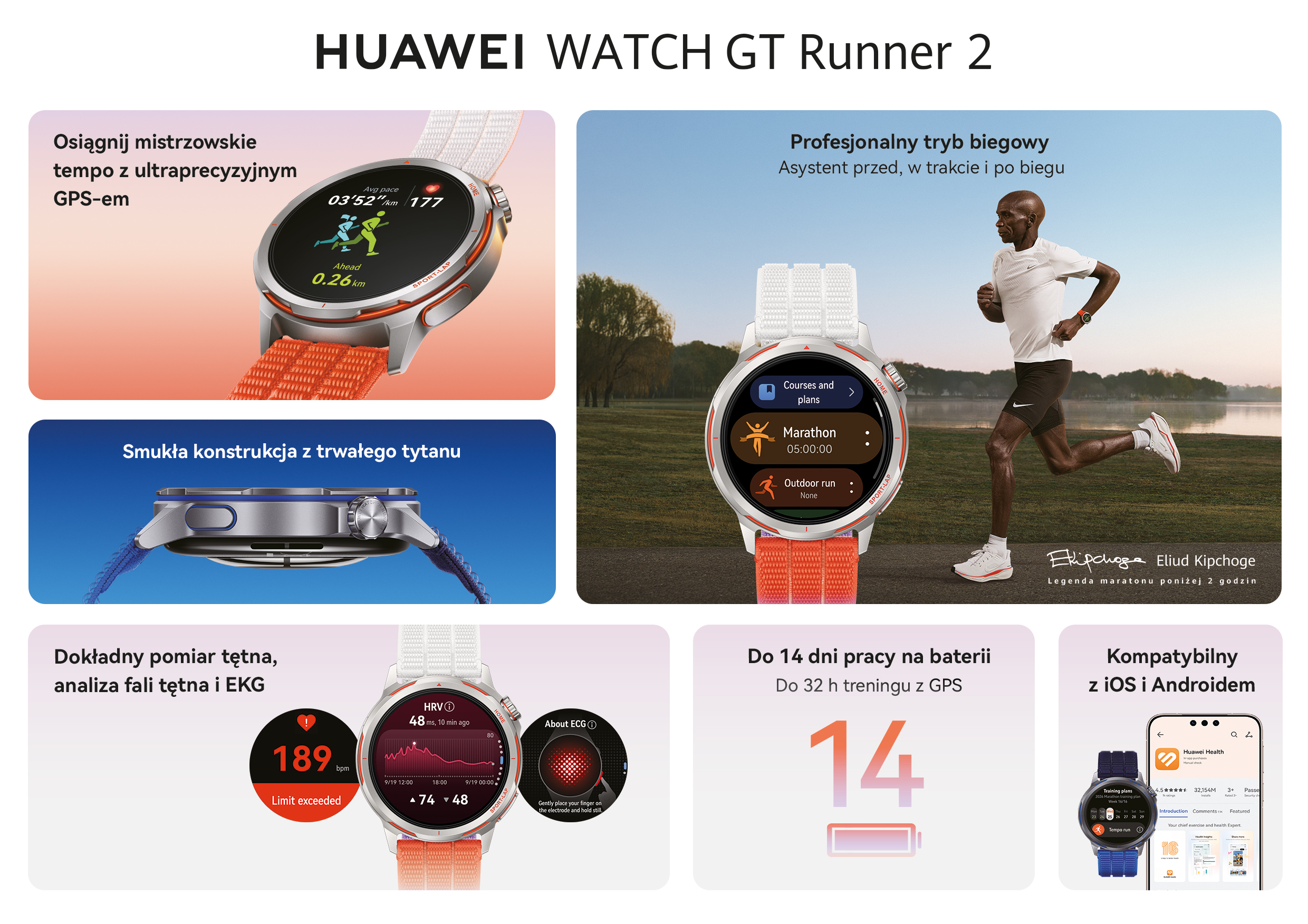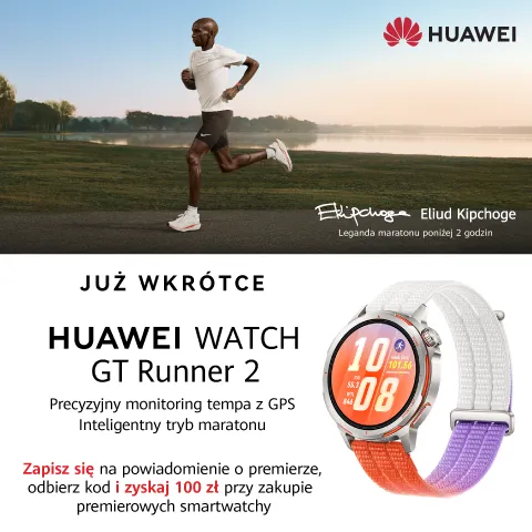 Kod dedykowany uprawniający do nabycia produktu premierowego w cenie dla osób zapisanych na powiadomienie zostanie udostępniony na adres e-mail podany w zgłoszeniu w terminie do dnia 09.03.2026 r. do godz. 15:00. Zgłoszenie możliwe jest do dnia 08.03.2026 r. do godz. 23:59. Kod umożliwia nabycie premierowych smartwatchy Huawei Watch GT Runner 2 w cenie o 100 zł niższej. Lista produktów premierowych możliwych do zakupu w cenie z kodem pojawi się w dniu premiery pod adresem wskazanym w wiadomości wysłanej na adres e-mail podany w zgłoszeniu. Kod ważny jest od dnia 09.03.2026 r. od godz. 9:00 do 12.04.2026 r. do godz. 23:45 lub do wyczerpania się asortymentu w sklepach RTV EURO AGD i na euro.com.pl (z wyłączeniem outletów). Kodu można użyć tylko 1 raz, ale w ramach jednej transakcji może być użyty na więcej niż 1 produkt. Dedykowane kody rabatowe nie łączą się. Szczegóły w sklepach i na euro.com.pl.