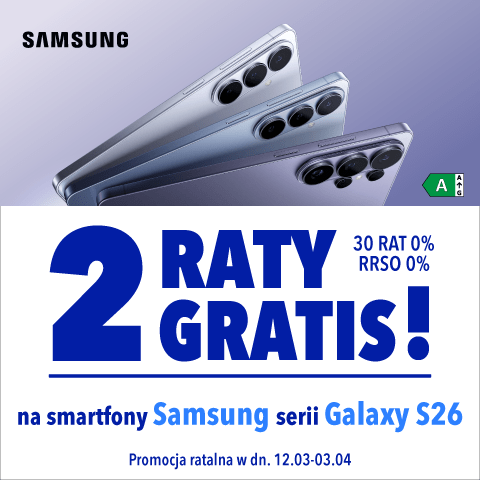 Promocja ratalna "2 raty gratis! 30 rat 0% RRSO 0% na Samsung serii Galaxy S26" obowiązuje od 12.03.2026 r. do 03.04.2026 r. Promocja obejmuje też usługi kupione łącznie z towarem objętym promocją. Min. wartość kredytu: 300,00 zł, maks. wartość kredytu 30 000,00 zł. Reprezentatywny przykład dla wartości kredytu 4019 zł: Rzeczywista Roczna Stopa Oprocentowania (RRSO) wynosi 0 %; całkowita kwota kredytu (bez kredytowanych kosztów) 4019 zł; całkowita kwota do zapłaty 4019 zł; stała stopa oprocentowania 0%; całkowity koszt kredytu 0 zł; czas obowiązywania umowy 30 miesięcy; liczba rat 30; wysokość raty 133.97 zł. Kredytu udziela bank współpracujący z Euro-net Sp. z o.o. (na dzień 5.01.2026 r.: Alior Bank, Credit Agricole Bank Polska, Bank Millennium, BNP Paribas Bank Polska). Euro-net Sp. z o.o. pośredniczy w udzielaniu kredytów oraz przyjmowaniu oświadczeń o odstąpieniu od umów kredytu. Zgodnie z regulaminem promocji pierwszą i drugą ratę kredytu wskazaną w harmonogramie spłat pokrywa organizator promocji, a kredytobiorca nie uiszcza jakichkolwiek należności z tego tytułu, w związku z tym dla reprezentatywnego przykładu całkowita kwota do zapłaty przez kredytobiorcę wynosi 3751.06 zł. Szczegóły, w tym Regulamin, w sklepach i na www.euro.com.pl