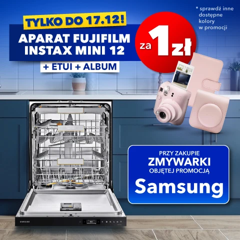 "Aparat Fujifilm Instax Mini 12 za 1 zł przy zakupie ze zmywarką marki Samsung – promocja na wybrane produkty" obowiązuje w sklepach RTV EURO AGD oraz na euro.com.pl (z wyłączeniem outletów) od: 27.11.2025 r. od godz. 15:00 do: 17.12.2025r. do godz. 23.45 lub do wcześniejszego wyczerpania się asortymentu. Obejmuje wybrane zmywarki marki Samsung oraz wybrane zestawy aparatów Fujifilm Instax Mini 12 z etui i albumem. Klient przy zakupie zmywarki może nabyć wskazany zestaw za 1 zł. Liczba zestawów w promocji ograniczona. Szczegóły promocji, w tym zasady jej łączenia się z innymi promocjami, w Regulaminie w sklepach i na euro.com.pl. Zapoznaj się z regulaminem.