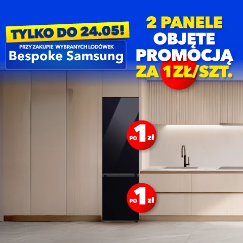 "Przy zakupie lodówki Bespoke panel górny i dolny za 1 zł każdy – promocja na wybrane produkty Samsung" obowiązuje w sklepach RTV EURO AGD oraz na euro.com.pl (z wyłączeniem outletów) do 24.05.2026 r. do godz. 23:45 lub do wcześniejszego wyczerpania się asortymentu. Obejmuje wybrane produkty marki Samsung. Klient przy zakupie lodówki Samsung Bespoke objętej promocją może nabyć wybrane spośród odpowiadających dwa różne panele tj. górny i dolny za 1 zł każdy. Szczegóły promocji, w tym zasady jej łączenia się z innymi promocjami w Regulaminie w sklepach i na euro.com.pl. Zapoznaj się z regulaminem.