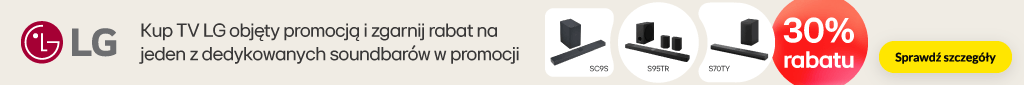Promocja obowiązuje w sklepach RTV EURO AGD oraz na euro.com.pl (z wyłączeniem outletów) od: 06.02.2026 r. od godz.: 15:00 do: 28.02.2026 r. do godz. 23:45 lub do wcześniejszego wyczerpania się asortymentu. Obejmuje wybrane telewizory marki LG. Klient przy zakupie telewizora objętego promocją może nabyć dedykowany soundbar z rabatem 30%. Wysokość rabatu zależy od wybranego modelu soundabra. Szczegóły promocji, w tym zasady jej łączenia się z innymi promocjami, w Regulaminie w sklepach RTV EURO AGD i na euro.com.pl. Zapoznaj się z regulaminem.