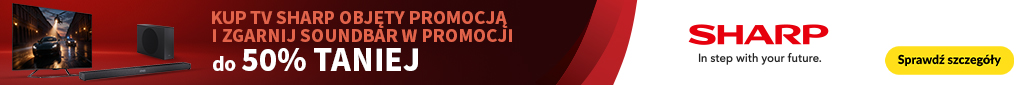 Promocja obowiązuje w sklepach RTV EURO AGD oraz na euro.com.pl (z wyłączeniem outletów) od: 12.02.2026 r. od godz.: 15:00 do: 04.04.2026 r. do godz. 23:45 lub do wcześniejszego wyczerpania się asortymentu. Obejmuje wybrane telewizory marki Sharp. Klient przy zakupie telewizora objętego promocją może nabyć dedykowany soundbar z rabatem do 50%. Wysokość rabatu zależy od wybranego modelu soundabra. Szczegóły promocji, w tym zasady jej łączenia się z innymi promocjami, w Regulaminie w sklepach RTV EURO AGD i na euro.com.pl. Zapoznaj się z regulaminem.