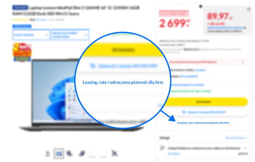 Aby zapoznać sie ze szczegółami ofery, wybierz produkt w cenie min. 615 zł brutto. Na stronie produktu kliknij link “Leasing, raty i odroczona płatność dla firm” pod przyciskiem “Do koszyka”.