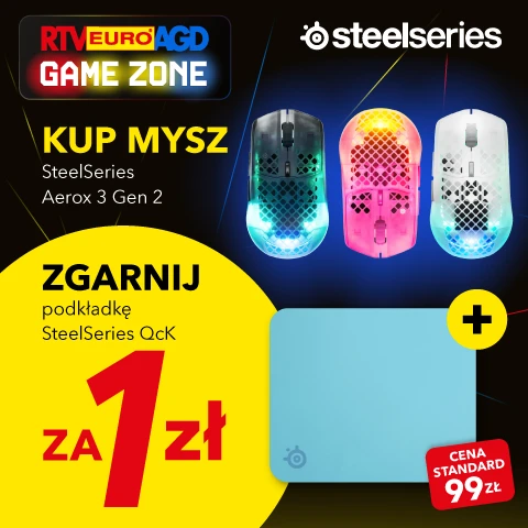 „Kup myszkę gaminigową SteelSeries Aerox 3 Gen 2 objetą promocją i zgarnij podkładkę SteelSeries Qck za 1 zł”obowiązuje w sklepach RTV EURO AGD oraz na euro.com.pl (z wyłączeniem outletów) od: 20.04.2026 r. od godz.15:00 do: 03.06.2026 r. do godz. 23.45 lub do wcześniejszego wyczerpania się asortymentu lub liczby produktów promocyjnych (podkładek), która wynosi łącznie 200 sztuk. Klient przy zakupie myszki gamingowej SteelSeries Aerox 3 Gen 2 objętej promocją może nabyć podkładkę SteelSeries Qck za 1 zł. Szczegóły promocji, w tym zasady jej łączenia się z innymi promocjami, w Regulaminie w sklepach RTV EURO AGD i na euro.com.pl.