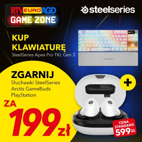„Kup klawiaturę mechaniczna StelSeries Apex Pro TKL Gen3 Us Biały i zgarnij słuchawki bezprzedowe z mikrofonem StelSeries Arctis GameBuds Playstation Dokanałowe Biały za 199 zł „ obowiązuje w sklepach RTV EURO AGD oraz na euro.com.pl (z wyłączeniem outletów) od: 20.04.2026 r. od godz. 15:00 do: 03.06.2026 r. do godz. 23.45 lub do wcześniejszego wyczerpania się asortymentu lub liczby produktów promocyjnych (słuchawek), która wynosi 30 sztuk. Klient przy zakupie klawiatury mechanicznej StelSeries Apex Pro TKL Gen3 Us Biały może nabyć słuchawki bezprzewodowe z mikrofonem StelSeries Arctis GameBuds Playstation Dokanałowe Białe w promocyjnej cenie 199 zł. Szczegóły promocji, w tym zasady jej łączenia się z innymi promocjami, w Regulaminie w sklepach RTV EURO AGD i na euro.com.pl.