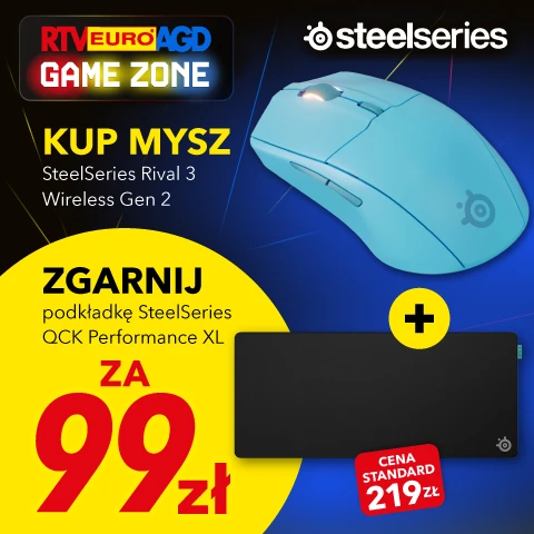 „Kup myszkę gamingową SteelSeries Rival 3 Wireless Gen 2 Turkusową i zgarnij podkładkę pod mysz SteelSeries QCK Perfomance XL Balance Czarny za 99 zł” obowiązuje w sklepach RTV EURO AGD oraz na euro.com.pl (z wyłączeniem outletów) od: 20.04.2026 r. od godz.15:00 do: 03.06.2026 r. do godz. 23.45 lub do wcześniejszego wyczerpania się asortymentu lub liczby produktów promocyjnych (podkładek), która wynosi 90 sztuk. Klient przy zakupie myszki gamingowej SteelSeries Rival 3 Wireless Gen 2 Turkusowa może nabyć podkładkę pod mysz SteelSeries QCK Perfomance XL Balance Czarny w promocyjnej cenie 99 zł. Szczegóły promocji, w tym zasady jej łączenia się z innymi promocjami, w Regulaminie w sklepach RTV EURO AGD i na euro.com.pl.