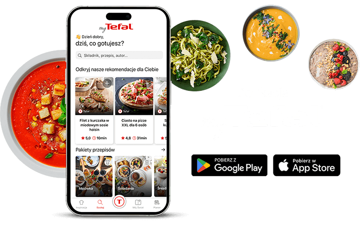 Odkryj bogactwo smaków na każdą okazję! Aplikacja MyTefal to tysiące przepisów z czytelnymi instrukcjami krok po kroku.