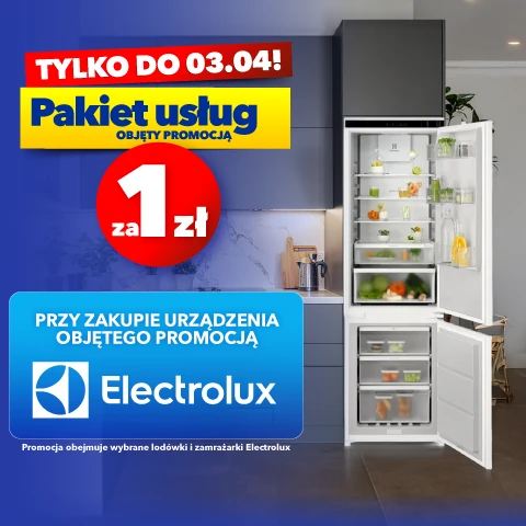 Promocja obowiązuje w sklepach RTV EURO AGD oraz na euro.com.pl (z wyłączeniem outletów) do 03.04.2026, do godz. 15:00. lub do wcześniejszego wyczerpania się asortymentu. Obejmuje wybrane lodówki i zamrażarki marki Electrolux oraz wybrane pakiety usług. Klient przy zakupie produktu objętego promocją może nabyć objęty promocją, jeden odpowiadający albo jeden, wybrany z odpowiadających pakiet usług za 1 zł. Szczegóły promocji, w tym zasady jej łączenia się z innymi promocjami w Regulaminie w sklepach i na euro.com.pl. Zapoznaj się z regulaminem.