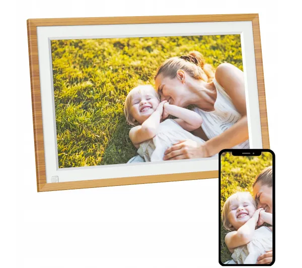 - Funkcje dodatkowe: automatyczny czujnik dopasowujący obraz do sposobu ustawienia ramki, regulacja jasności