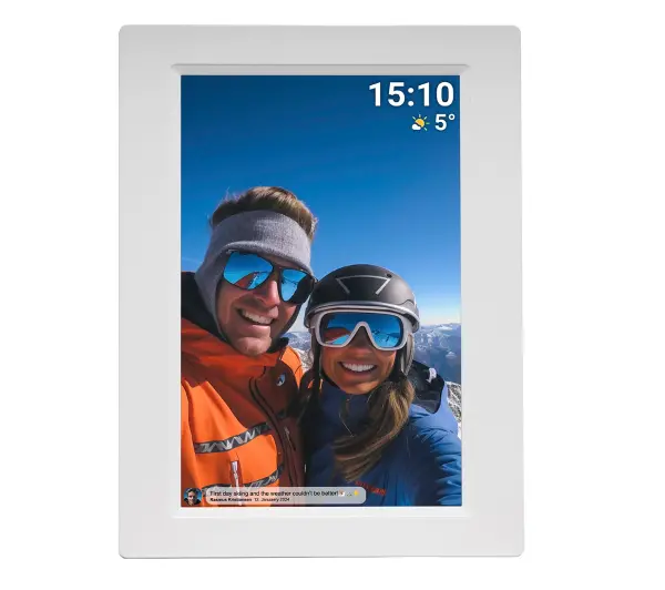 <h2>Denver Frameo PFF-1015W 10.1’’</h2>Ożyw wspomnienia dzięki ramce cyfrowej z 10,1-calowym ekranem o wysokiej rozdzielczości. Denver Frameo PFF-1015W posiada łączność Wi-Fi oraz wbudowaną pamięć 16 GB pozwalającą na przechowywanie tysięcy zdjęć. Łatwą obsługę zapewnia funkcja dotykowa i dedykowana aplikacja.Nieograniczone Udostępnianie: Dzięki aplikacji Frameo możesz przesyłać zdjęcia na dowolną liczbę ramek dodanych do aplikacjiWspółdzielenie z Bliskimi: Umożliwiaj znajomym i rodzinie dodawanie zdjęć do Twojej ramkiEkran o przekątnej 10,1 cala i rozdzielczości 1280x800 dla wyjątkowej wyrazistości obrazuDotykowy ekran – łatwa, intuicyjna obsługa Połączenie Wi-Fi (2.4 GHz) – opcja wygodnego, bezprzewodowego przesyłania materiałów do urządzeniaFunkcja timera – możliwość wyboru czasu wyświetlania zdjęciaPamięć 16 GB oraz gniazdo kart microSD – pomieści tysiące zdjęćDedykowana aplikacja Frameo gotowa do pobrania na urządzenia z Android oraz iOs, umożliwiająca łatwe dodawanie zdjęć<h2>Poznaj ramkę cyfrową Denver Frameo PFF-1015W</h2> Dzielenie się WspomnieniamiDzięki aplikacji Frameo możesz dzielić się swoimi zdjęciami. Wystarczy, że dodasz ramkę do aplikacji, a zdjęcia można przesyłać z dowolnego miejsca na świecie na dowolną liczbę ramek! Co więcej, dzięki możliwości zaproszenia znajomych i rodziny do współtworzenia galerii, każdy z nich może dodawać swoje zdjęcia. Wspomnienia nigdy nie były tak blisko – dla Ciebie i Twoich bliskich! Ekran 10,1 calaOżyw swoje wspomnienia na 10,1-calowym ekranie ramki cyfrowej Denver Frameo PFF-1015W. Dzięki rozdzielczości 1280x800 pikseli wyświetlane obrazy zachwycają doskonałą ostrością i wyrazistością. Idealny do umieszczania na biurku, komodzie czy półce gadżet pozwala cieszyć się ulubionymi zdjęciami w wyjątkowej jakości. Wygodny dotykowy ekranDotykowy ekran Denver Frameo PFF-1015W wprowadza nową jakość obsługi – intuicyjną, łatwą i przyjazną dla użytkownika. Przesuwaj zdjęcia, wybieraj ulubione ustawienia lub zmieniaj kolejność wyświetlanych wspomnień za pomocą prostych gestów. Zarządzanie albumami jeszcze nigdy nie było tak proste! Komunikacja przez Wi-FiPołącz się ze światem i dziel się wspomnieniami dzięki wbudowanej funkcji Wi-Fi (2.4 GHz). Denver Frameo PFF-1015W umożliwia łatwe przesyłanie zdjęć z dowolnego miejsca na świecie bezpośrednio do ramki – wystarczy dostęp do internetu. Możesz błyskawicznie dzielić się najnowszymi chwilami z rodziną i przyjaciółmi, niezależnie od odległości. Funkcja timeraRamka cyfrowa została wyposażona w funkcję praktycznego timera, który pozwala ustawić czas wyświetlania każdego zdjęcia przed przejściem do następnego. Zapewnij sobie pełną kontrolę nad tempem pokazu slajdów, umożliwiając płynne dopasowanie do własnych preferencji. Tryb uśpienia Ramka Denver Frameo PFF-1015W oferuje tryb uśpienia, który wyłącza ekran w celu zmniejszenia zużycia energii. Domyślnym ustawieniem jest wyłączenie ekranu o 23:00 i ponowne włączenie ekranu o 07:00. Aby zmienić to ustawienie, wystarczy ustawić czas rozpoczęcia/zakończenia trybu uśpienia. Twoja ramka nie zostanie wyłączona ani przełączona w tryb czuwania, więc nadal pozwala na odbieranie zdjęć w trybie uśpienia. Pamięć 16 GBUrządzenie posiada wbudowaną pamięć o pojemności 16 GB, pozwalającą na przechowywanie tysięcy zdjęć bez konieczności korzystania z dodatkowych nośników. Ramka cyfrowa Denver Frameo PFF-1015W wyposażona jest też w gniazdo kart microSD, umożliwiające rozszerzenie pamięci i importowanie zdjęć bezpośrednio z karty. Aplikacja FrameoRamka współpracuje z aplikacją Frameo, dostępną na smartfony i tablety z systemem Android i iOS. Umożliwia ona bezprzewodowe przesyłanie zdjęć i filmów bezpośrednio do ramki z dowolnego miejsca na świecie. Dzięki temu możesz dzielić się swoimi wspomnieniami z rodziną i przyjaciółmi w czasie rzeczywistym, a także dodawać opisy do zdjęć. Pokaz slajdówDenver Frameo PFF-1015W posiada funkcję pokazu slajdów, czyli automatycznego wyświetlania zdjęć w ustalonej kolejności i w wybranym czasie. Dostosuj interwały między zdjęciami oraz efekty przejścia, tworząc spersonalizowaną prezentację wspomnień - autorską dekorację do domu lub biura! Filmy do 15 sekundUrządzenie obsługuje odtwarzanie krótkich filmów o maksymalnej długości 15 sekund. Z jego pomocą wyświetlisz zarówno statyczne zdjęcia, jak i wspomnienia w formie video. Zaprezentuj za pomocą Denver Frameo PFF-1015W ważne chwile w bardziej dynamiczny, wywołujący emocje sposób. Wbudowany głośnikWbudowany w Denver Frameo PFF-1015W głośnik pozwala odtwarzać dźwięk z filmów. Dzięki temu możesz cieszyć się pełnym doświadczeniem multimedialnym łączącym obraz i dźwięk. Ramka cyfrowa staje się nie tylko narzędziem do wyświetlania zdjęć, ale też prawdziwym centrum multimedialnym, które ożywia wspomnienia. Pion lub poziom do wyboruWszechstronną ramkę cyfrową Denver Frameo PFF-1015W możesz ustawić w pionie i poziomie, dostosowując wyświetlanie zdjęć i filmów do rodzaju prezentowanych materiałów, do aranżacji przestrzeni lub do własnych preferencji estetycznych. Urządzenie posiada otwory montażowe do zawieszania na ścianie, a w zestawie znajdziesz praktyczną podpórkę do postawienia na szafce lub stoliku.Zawartość opakowania Denver Frameo PFF-1015WW opakowaniu Ramka cyfrowa ZasilaczDenver – marka godna zaufaniaBogate portfolioKilkaset produktów dla fanów elektronikiWieloletnie doświadczenie Marka założona w 1990 rokuNajwyższe standardy jakościNowatorskie technologie w przyjaznych cenach