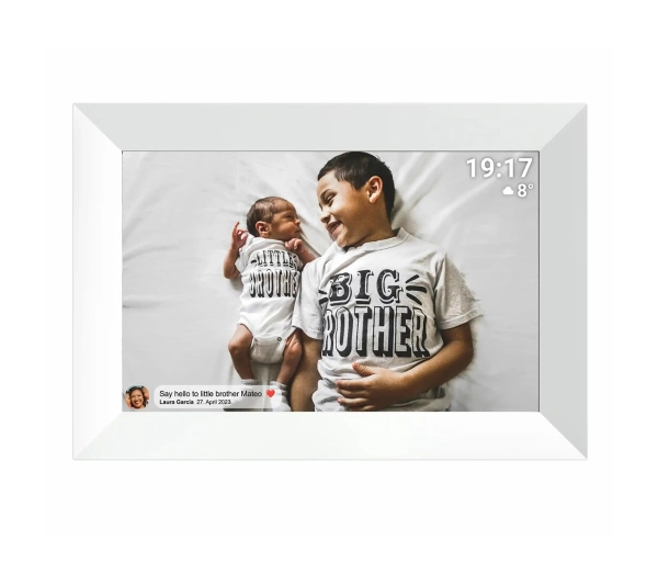 Funkcje dodatkowe: automatyczne włączanie i wyłączanie wyświetlacza o ustawionym czasie, automatyczny czujnik dopasowujący obraz do sposobu ustawienia ramki, bezprzewodowe przesyłanie zdjęć, możliwość obracania zdjęć, obsługa poprzez ekran dotykowy, odtwarzanie filmów Full HD, odtwarzanie filmów w jakości HD (720p), podświetlenie LED, prognoza pogody, przeglądanie miniatur / menedżer plików, przesyłanie zdjęć za pomocą aplikacji Frameo, różne tryby pokazu slajdów, WiFi, zegar, kalendarz, złącze USB