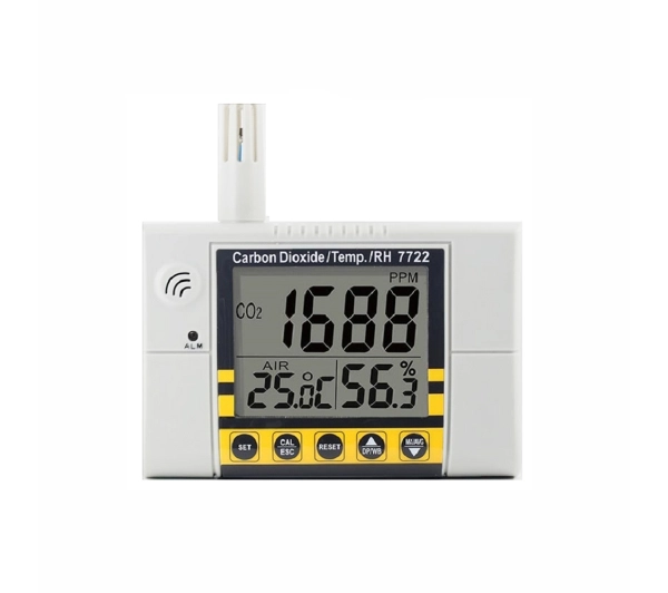 AZ 7722 to miernik przeznaczony do monitorowana jakości powietrza w pomieszczeniach.<p>Przystosowany do pracy ciągłej z wykorzystaniem funkcji sterowania, przez wyjście stykowe, zewnętrznymi urządzeniami (np. wentylatorami, zaworami elektromagnetycznymi itp.) lub do rutynowych pomiarów chwilowych.</p><p>Umożliwia jednoczesny pomiar poziomu dwutlenku węgla, temperatury oraz wilgotności. Posiada wbudowany czujnik NDIR (Non-Dispersive Infrared) pozwalający na precyzyjny pomiar poziomu CO2 w czasie rzeczywistym oraz wysokiej klasy sensor Rotronic do pomiaru wilgotności. Wyniki przedstawiane są na trójpolowym wyświetlaczu ciekłokrystalicznym.</p><p>Użytkownik ma możliwość ustawienia progu alarmowego CO2 po przekroczeniu, którego zostanie włączona sygnalizacja optyczno-dźwiękowa, zmiany jednostek odczytu temperatury (°C lub °F) oraz wyboru wartości wyświetlanych na panelu ciekłokrystalicznym. Urządzenie może pracować w trybie pomiaru wartości bieżących, wartości minimalnych / maksymalnych (funkcja MIN i MAX) oraz średnich dla interwałów czasowych 8h i 15 min (funkcja TWA (Time-Weighted Average) i STEL (Short-Term Exposure Limit)).</p><p>Port RS232 umożliwia połączenie z komputerem PC (Personal Computer) w celu zapisywania bieżących wskazań, po wcześniejszym zainstalowaniu oprogramowania. Miernik posiada funkcję automatycznej kalibracji czujnika CO2 oraz dwupunktową kalibrację sensora wilgotności.</p><p>AZ 7722 jest zasilany za pośrednictwem zasilacza sieciowego DC (Direct Current) 12V 0.5A.</p><p>ZASTOSOWANIEPomiary na stanowiskach pracy, przemysł rolno-spożywczy, fermy drobiu, szklarnie, magazyny żywności, magazyny butli CO2, magazyny środków gaśniczych, pomieszczenia z instalacją gaśniczą na bazie CO2, browary, rozlewnie napojów gazowanych, gorzelnie, zakłady przemysłu fermentacyjnego, do monitorowania procesów przemysłowych, weryfikacja poprawności wykonania instalacji HVAC (klimatyzacji i wentylacji).</p><p>ZALETY</p><ul> <li>Podświetlany, trójpolowy wyświetlacz ciekłokrystaliczny</li> <li>Stabilny i dokładny czujnik NDIR</li> <li>Wysoka czułość, selektywność i trwałość</li> <li>Jednoczesny pomiar wartości CO2, temperatury, wilgotności</li> <li>Określenie temperatury topnienia i parowania WET BULB</li> <li>Pomiar temperatury punktu rosy DEW POINT</li> <li>Przydatne funkcje: MAX/MIN, TWA i STEL</li> <li>Sygnalizacja przekroczenia progów alarmowych</li> <li>Wyjście stykowe do sterowania np. wentylatorami, stycznikami, elektrozaworami</li> <li>Funkcja auto-kalibracji czujnika CO2</li></ul><p>Możliwość współpracy z komputerem PC</p>