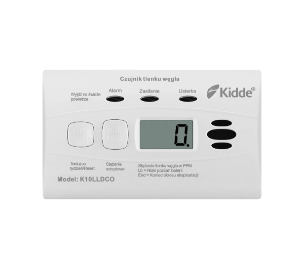 <h2>Kidde K10LLDCO</h2>Zadbaj o bezpieczeństwo swoje i swoich bliskich, instalując w mieszkaniu urządzenie Kidde K10LLDCO. Będzie ono na bieżąco monitorowało stężenie tlenku węgla w powietrzu i w razie przekroczenia norm wyda z siebie głośny sygnał alarmowy, dzięki któremu zdążysz odpowiednio zareagować na sytuację zagrożenia.Wyświetlacz LCD pozwala monitorować stężenie czadu – pokazuje zawartość tlenku węgla w zakresie od 0 do 999 PPMUkład kontroli sprawności czuwa nad prawidłowym działaniem czujnikaSensor elektrochemiczny ma własną, niezawodną baterię i 10-letnią gwarancję niezawodnej pracyUrządzenie spełnia wyśrubowane standardy i normy bezpieczeństwaPrzycisk testu pozwala sprawdzić, czy czujnik czadu działa bez zastrzeżeńGłośna sygnalizacja alarmowa poinformuje Cię o przekroczeniu norm stężenia czadu<h2>Poznaj czujnik czadu Kidde K10LLDCO</h2> Stała kontrolaCzujnik czadu Kidde K10LLDCO nie tylko zaalarmuje Cię o potencjalnym zagrożeniu pojawiającym się w Twoim domu, ale również pozwoli mieć na bieżąco pod kontrolą poziom stężenia tlenku węgla w powietrzu. Urządzenie wyposażone zostało bowiem w wyświetlacz LCD pokazujący aktualną zawartość czadu w zakresie od 0 do 999 PPM. Niezawodna praca urządzeniaKidde K10LLDCO pomoże Ci się ochronić przed skutkami zaczadzenia, ale tylko wtedy, gdy sam będzie pracował prawidłowo. Dlatego też w czujniku znajduje się układ kontroli sprawności, który ciągle bada, czy sensor, wewnętrzne obwody, a nawet bateria działają właściwie. W razie jakiejś awarii na urządzenie poinformuje Cię o tym sygnałami graficznymi, świetlnymi i dźwiękowymi. Aż 10 lat gwarancjiMożesz mieć pewność, że urządzenie Kidde K10LLDCO nie zawiedzie Cię przez wiele lat. Najlepszym dowodem na jego perfekcyjną pracę jest 10-letnia gwarancja działania sensora elektrochemicznego, który dodatkowo zasilany jest za pomocą baterii niewymagającej wymiany przez cały okres używania czujnika. Dzięki temu możesz poczuć się bezpieczniej w swoim domu. Zgodny ze standardamiKidde K10LLDCO to doskonały wybór dla osób, które szukają sprawdzonego czujnika czadu, który zapewni im maksimum bezpieczeństwa. Ten model ma znak budowlany "B" i spełnia polskie normy PN-EN 50291-1:2018+AC 2021. Dodatkowo został odznaczony certyfikatem BSI gwarantującym spełnienie wymagań normy BS EN 50291-1:2018. Praktyczne funkcjeW każdej chwili możesz sprawdzić, czy urządzenie Kidde K10LLDCO działa prawidłowo. Po prostu wciśnij przycisk testu i zobacz, czy czujnik prawidłowo przeszedł kontrolę. Co więcej, możesz także zajrzeć w historię urządzenia i przekonać się, jaki był najwyższy wynik zarejestrowanego stężenia tlenku węgla od czasu pierwszego uruchomienia produktu w Twoim domu. Donośny alarmJeśli czujnik czadu Kidde K10LLDCO wykryje, że normy stężenia tlenku węgla w otoczeniu zostały przekroczone, wyda z siebie bardzo głośny sygnał – taki, który w razie potrzeby wyrwie Cię z głębokiego snu w środku nocy. Dzięki temu możesz spać spokojnie bez obaw, że w razie zagrożenia życia swojego i swoich bliskich przegapisz alarm czujnika.<h2>Zawartość opakowania Kidde K10LLDCO</h2>W opakowaniu Czujnik czaduKidde – marka godna zaufaniaPonad 100 lat doświadczeniaMarka założona w 1917 roku przez Waltera KiddeZ myślą o bezpieczeństwieJeden z największych producentów czujników dymu i produktów przeciwpożarowych Produkty zaawansowane technologicznieKorzystanie z najnowszych rozwiązań w celu udoskonalania precyzji pracy urządzeń ratujących życie