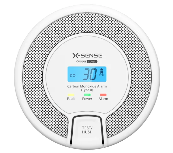 <h2>Czujnik tlenku węgla X-Sense CO03D</h2><p>X-Sense CO03D to niezawodny czujnik tlenku węgla, który czuwa nad Twoim bezpieczeństwem 24/7. Dzięki zastosowanemu sensorowi elektrochemicznemu Figaro urządzenie monitoruje poziom CO (carbon monoxide, tlenek węgla) w zakresie od 30 do 999 ppm (parts per million, części na milion), zapewniając błyskawiczną reakcję na wszelkie zmiany stężenia. Stałe monitorowanie i wysoka czułość pozwalają na wczesne wykrycie zagrożenia, zanim stężenie osiągnie poziom niebezpieczny dla zdrowia.</p><h2>Alarm optyczny i dźwiękowy oraz czytelny ekran</h2><p>Czujnik wyposażono w duży i czytelny ekran LCD (Liquid Crystal Display, wyświetlacz ciekłokrystaliczny), który pokazuje bieżący poziom tlenku węgla w pomieszczeniu. Trójkolorowe diody LED (Light Emitting Diode, dioda emitująca światło) informują o stanie pracy urządzenia: zielona oznacza prawidłowe działanie, żółta – niski poziom baterii, a czerwona – aktywację alarmu. Głośny sygnał dźwiękowy (≥ 85 dB) gwarantuje, że alert zostanie usłyszany nawet podczas snu lub w innych pomieszczeniach.</p><h2>Reakcja dopasowana do poziomu zagrożenia</h2><p>Dzięki inteligentnemu systemowi czas reakcji alarmu uzależniony jest od poziomu stężenia CO. Przykładowo: przy 30 ppm alarm uruchamia się po 120 minutach, przy 50 ppm po 60–90 minutach, a przy 300 ppm – już po 3 minutach. Takie rozwiązanie pozwala uniknąć fałszywych alarmów, a jednocześnie zapewnia szybką reakcję na realne niebezpieczeństwo.</p><h2>Zasilanie bateryjne i łatwa konserwacja</h2><p>Czujnik X-Sense CO03D zasilany jest trzema wymiennymi bateriami alkalicznymi AA (typ baterii o napięciu 1,5 V), co pozwala na samodzielną obsługę bez potrzeby angażowania serwisu. Wbudowana funkcja powiadamiania o niskim poziomie energii informuje użytkownika o konieczności wymiany baterii, zapewniając ciągłość działania.</p><h2>Pełna kontrola dzięki funkcji testu i wyciszenia</h2><p>Urządzenie wyposażono w przycisk test/silence, który pozwala przeprowadzić regularne testy poprawności działania oraz tymczasowo wyciszyć alarm. Jest to szczególnie przydatne w przypadku fałszywego alarmu lub gdy poziom CO szybko wraca do normy, eliminując potrzebę natychmiastowej interwencji.</p><h2>Certyfikowana jakość i elegancki wygląd</h2><p>Model CO03D spełnia surowe normy bezpieczeństwa EN 50291 (European Norm 50291, europejska norma dla domowych czujników tlenku węgla) i UL 2034 (Underwriters Laboratories, norma amerykańska), a także posiada certyfikaty BSI (British Standards Institution) i CE (Conformité Européenne, zgodność europejska), które potwierdzają jego wysoką jakość i zgodność z europejskimi oraz międzynarodowymi standardami. Kompaktowy, minimalistyczny design sprawia, że czujnik dyskretnie wpisuje się w estetykę każdego wnętrza.</p>
