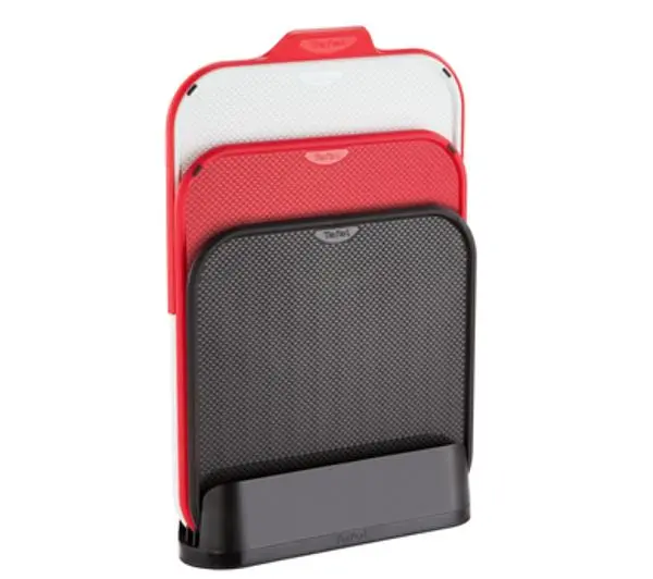 Zestaw desek do krojenia Ingenio: sprytny sposób na krojenieZestaw desek do krojenia Tefal Ingenio to sprytne rozwiązanie w dziedzinie krojenia. Odwracalne deski w 3 rozmiarach doskonale dostosowane są do wszystkich potrzeb w dziedzinie krojenia. Antypoślizgowa podkładka utrzymuje deskę na miejscu dla większej wygody użytkowania, zaś praktyczny rowek na soki sprawia, że blaty kuchenne pozostają czyste. Deski nie zajmują za wiele miejsca, ponieważ umieszcza się je w pozycji pionowej w praktycznym bloku do przechowywania.