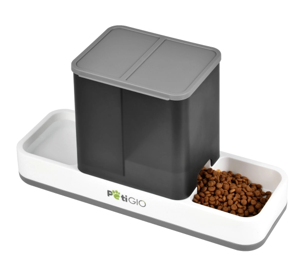<h2>Dozownik na wodę i karmę 2w1 dla zwierząt Peti-to-Eat PETI-130</h2><p>Dozownik 2w1 Peti-to-Eat to doskonały wybór dla opiekunów, którzy cenią sobie porządek i wygodę. Dzięki zintegrowanej konstrukcji zarówno miska na karmę, jak i pojemnik na wodę znajdują się w jednym miejscu, co pozwala lepiej zorganizować przestrzeń wokół pupila i zaoszczędzić cenne miejsce.</p><h3>Zawsze świeża woda bez wysiłku</h3><p>Dzięki systemowi podciśnieniowemu woda w misce automatycznie się uzupełnia, gdy jej poziom spadnie. To gwarancja stałego dostępu do świeżej wody – nawet wtedy, gdy nie ma Cię w domu. Pojemność 1 litra świetnie sprawdzi się w codziennym użytkowaniu.</p><h3>Większe pojemniki – mniej obowiązków</h3><p>Urządzenie pomieści aż 2,2 kg suchej karmy oraz 1 litr wody, co pozwala znacznie ograniczyć częstotliwość uzupełniania. To idealne rozwiązanie zarówno dla psów, jak i kotów – bez względu na ich wielkość czy apetyt.</p><h3>Kluczowe cechy i korzyści</h3><h4>Łatwość czyszczenia i trwałość</h4><p>Wysokiej jakości tworzywa PP (polipropylen) i PET (politereftalan etylenu) są nie tylko odporne na uszkodzenia, ale też bezpieczne dla zwierząt. Gładkie powierzchnie umożliwiają szybkie i wygodne czyszczenie – zachowanie higieny nie będzie już problemem.</p><h4>Nowoczesny wygląd</h4><p>Minimalistyczna forma oraz stonowane barwy – biel i szarość – sprawiają, że dozownik ładnie wpasuje się w każde wnętrze. Kompaktowe rozmiary (23 x 39 x 13,5 cm) sprawiają, że z łatwością zmieści się nawet w mniejszych pomieszczeniach.</p><h4>Stabilność na co dzień</h4><p>Antypoślizgowe nóżki zapobiegają przesuwaniu się dozownika, co ma znaczenie szczególnie przy bardziej ruchliwych zwierzakach. Dzięki temu miski pozostają na miejscu, a Ty unikasz bałaganu z rozsypaną karmą lub rozlaną wodą.</p><h3>Zawartość opakowania</h3><ul> <li>Dozownik na wodę i karmę 2w1</li> <li>Zbiornik na wodę: 1l</li> <li>Pojemnik na karmę: 2,2l</li></ul>