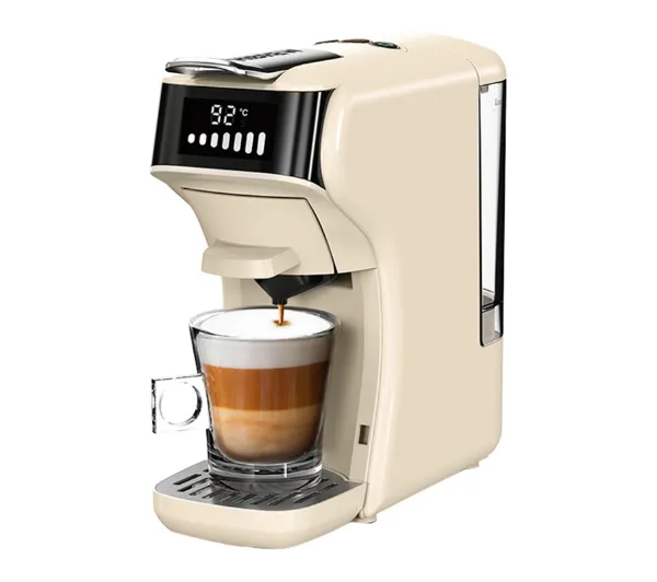 <h2>Ekspres na kapsułki HIBREW H1B 5w1 (beżowy)</h2><p>Kapsułkowy ekspres HiBREW H1B to uniwersalne urządzenie stworzone z myślą o miłośnikach kawy, którzy oczekują wygody, różnorodności i doskonałego smaku. Model 5w1 umożliwia przygotowanie napojów zarówno na gorąco, jak i na zimno, dzięki czemu sprawdzi się o każdej porze roku. Szeroka kompatybilność z popularnymi kapsułkami oraz różnymi rodzajami kawy pozwala cieszyć się ulubionymi smakami bez ograniczeń. Nowoczesne technologie parzenia dbają o intensywny aromat napoju, a elegancki, beżowy design sprawia, że urządzenie staje się stylowym elementem wyposażenia kuchni.</p><h2>Zaawansowany system ekstrakcji kawy</h2><p>Ekspres HiBREW H1B został wyposażony w funkcję programowalnego parzenia wstępnego, która odpowiednio nawilża kawę przed właściwą ekstrakcją. Dzięki temu możliwe jest pełniejsze wydobycie głębi smaku i aromatu ziaren. Urządzenie pracuje z ciśnieniem 20 barów, co przekłada się na intensywny charakter napoju oraz gęstą, kremową piankę, charakterystyczną dla kaw przygotowywanych w profesjonalnych kawiarniach.</p><h2>Szeroka kompatybilność kapsułek i kawy</h2><p>Model H1B oferuje dużą swobodę wyboru sposobu przygotowania napoju. Ekspres obsługuje kapsułki Nespresso oraz Dolce Gusto, a dzięki dołączonym adapterom umożliwia również korzystanie z kawy mielonej, saszetek ESE (Easy Serving Espresso) oraz kapsułek KCup. Tak rozbudowana kompatybilność pozwala eksperymentować z różnymi mieszankami, smakami i rodzajami kawy, dopasowując napój do aktualnego nastroju lub preferencji.</p><h2>Regulacja parametrów parzenia</h2><p>Urządzenie pozwala łatwo zmieniać tryb przygotowania napojów – od kaw gorących po orzeźwiające wersje na zimno. Przełączanie pomiędzy trybami odbywa się jednym dotknięciem, co sprawia, że obsługa jest wyjątkowo prosta. Dodatkowo użytkownik może dopasować temperaturę ekstrakcji oraz ilość wody w zakresie od 30 do 210 ml, dzięki czemu każdą filiżankę kawy można przygotować dokładnie tak, jak się lubi.</p><h2>Komfort użytkowania i elegancka konstrukcja</h2><p>HiBREW H1B wyróżnia się solidnym metalowym uchwytem o połyskującym wykończeniu, który podkreśla elegancki charakter urządzenia i jednocześnie zapewnia trwałość podczas codziennego użytkowania. Przestronna strefa na kubek pozwala korzystać z ulubionych filiżanek lub wyższych szklanek. Ekspres został również wyposażony w automatyczny system zwalniania ciśnienia po zakończeniu parzenia, co zwiększa bezpieczeństwo obsługi. Funkcja usuwania pozostałej wody po ekstrakcji zapobiega kapaniu, pomagając utrzymać czystość i wygodę korzystania z urządzenia każdego dnia.</p>