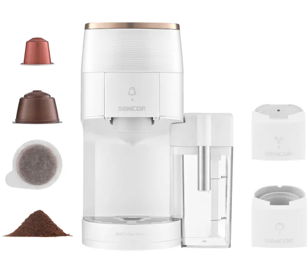 Wyposażenie: miarka do kawy mielonej, instrukcja obsługi w języku polskim, karta gwarancyjna, spieniacz do mleka, adapter do kawy mielonej, adapter do kapsułek Dolce Gusto, adapter do kapsułek Nespresso