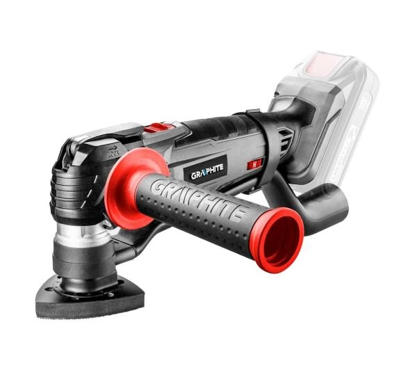 Wszechstronne elektronarzędzie do cięcia, szlifowania, skrobania materiałów, takich jak metal, drewno, czy ceramika. Szybka i beznarzędziowa wymiana akcesoriów ułatwia wykonywaną pracę. Uniwersalny uchwyt pozwala na stosowanie różnorodnych końcówek GRAPHITE, a także wielu akcesoriów innych marek. Przekładnia wykonana z wytrzymałego stopu aluminium, a zestaw jest wyposażony w adapter odsysu pyłu pozwalający na podłączenie odkurzacza w czasie prac szlifierskich. Urządzenie pozwala także na dwupozycyjny montaż dodatkowej rękojeści, miejsce wykonanej pracy oświetlane jest przez dwie diody LED. Współpracuje z akumulatorami 18V Li-Ion GRAPHITE Energy+.Charakterystyka produktu:<ul> <li>Możliwość stosowania różnych końcówek</li> <li>Głowica urządzenia wykonuje od 5000 do 20000 oscylacji w ciągu minuty, kąt oscylacji wynosi 3°</li> <li>Beznarzędziowa wymiana akcesoriów</li> <li>Adapter odsysu pyłu</li> <li>Ogumowana rękojeść zapewnia pewny chwyt urządzenia</li> <li>Możliwość montażu dodatkowej rękojeści</li> <li>Współpracuje z akumulatorami 18V Li-Ion GRAPHITE Energy+.</li></ul>Specyfikacja: <ul> <li>Urządzenie wielofunkcyjne akumulatorowe 18V, Li-Ion</li> <li>Liczba oscylacji 5000 - 20000 min⁻¹</li> <li>Kąt oscylacji 3°, stopa 80x80x80 mm, (LxH) 300 x 140 mm</li> <li>Masa 1.8 kg</li> <li>Akcesoria: końcówki robocze - 2 szt, papier ścierny - 1 szt</li> <li>Kompatybilne z akumulatorami Energy+ </li></ul>