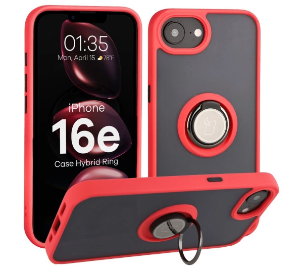 Etui Bizon z uchwytem na palec Hybrid Ring do Apple iPhone 16e Przydymione z Czerwoną ramką