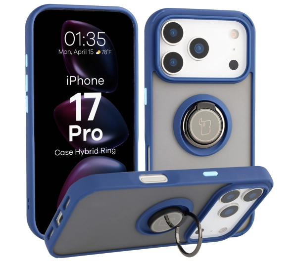 Etui Bizon z uchwytem na palec Hybrid Ring do Apple iPhone 17 Pro Przydymione z granatową ramką
