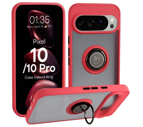 Etui Bizon z uchwytem na palec Hybrid Ring do Google Pixel 10 / Google Pixel 10 Pro Przydymione z Czerwoną ramką