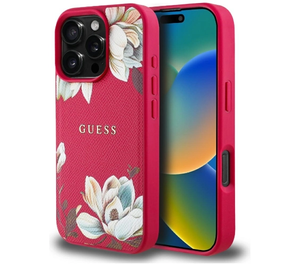 Etui Guess Grained Printed Flower Pattern MagSafe do iPhone 16 Pro Fuksja