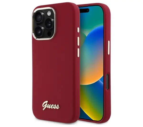 Etui Guess Silicone Script Metal Logo do iPhone 16 Pro Bordowy