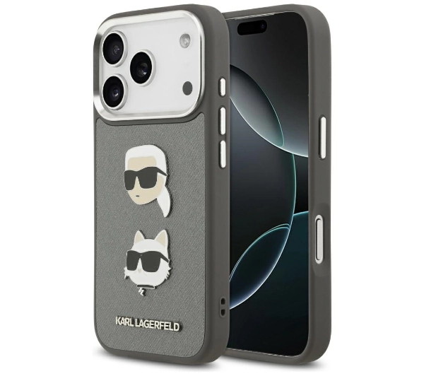 Etui Karl Lagerfeld FW Grained Karl & Choupette Heads Pins & Logo do iPhone 17 Pro Szary
