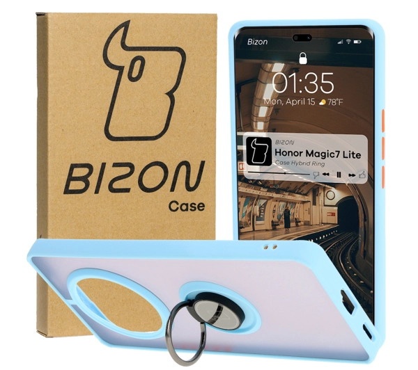 Etui Bizon z uchwytem na palec Hybrid Ring do Honor Magic7 Lite Przydymione z jasnoniebieską ramką