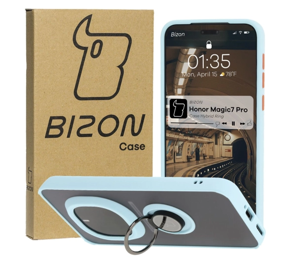 Etui Bizon z uchwytem na palec Hybrid Ring do Honor Magic7 Pro Przydymione z jasnoniebieską ramką