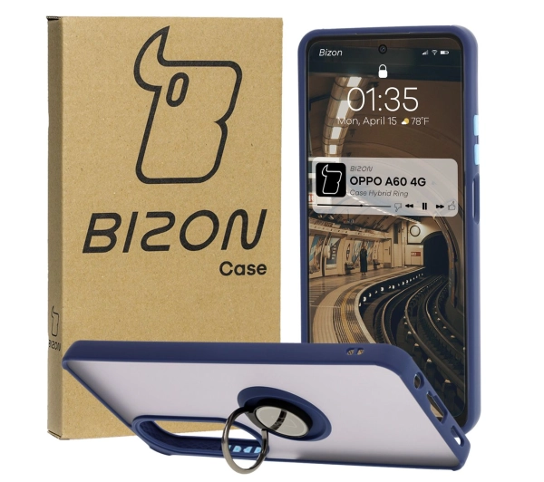 Etui Bizon z uchwytem na palec Hybrid Ring do Oppo A60 4G przydymione z Granatową ramką