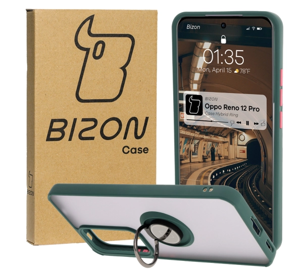 Etui Bizon z uchwytem na palec Hybrid Ring do Oppo Reno 12 Pro przydymione z Ciemnozieloną ramką