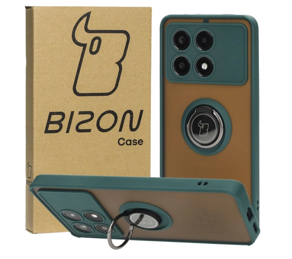 Etui Bizon z uchwytem na palec Hybrid Ring do Xiaomi Poco X6 Pro Przydymione z ciemnozieloną ramką