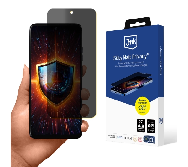 <h2>3mk Silky Matt Privacy™ - Zachowaj informacje tylko dla siebie</h2><p>Ekran widoczny tylko dla użytkownika – funkcja prywatyzacji aktywna już przy 30oFunkcjonalne, matowe wykończenie - redukcja odblasków i brak odcisków palcówWysoka ochrona przed zarysowaniem – wzmocnienie wyświetlacza nawet do 250%Prosta i bezpieczna aplikacja na mokro – montaż przy użyciu specjalistycznego żelu</p><h3>Prywatyzująca folia ochronna – matowa i przejrzysta</h3><p>Używasz telefonu w miejscach publicznych i chcesz chronić poufne treści? Wybierz matową, prywatyzującą folię 3mk Silky Matt Privacy™, która zabezpiecza ekran smartfona. Dzięki niej możesz bez stresu korzystać z telefonu w komunikacji, biurze, restauracji czy parku. Efekt prywatyzacji (rozmycie i przyciemnienie) działa już od kąta 30°, więc tylko Ty widzisz obraz wyraźnie. Co ważne, 3mk Silky Matt Privacy™ nie powoduje efektu żaluzji, typowego dla wielu standardowych filtrów.</p><h3>Czytelny obraz w słońcu i ekran bez śladów palców</h3><p>Chcesz wygodnie korzystać ze smartfona w słońcu, bez męczenia wzroku i szukania cienia? 3mk Silky Matt Privacy™ dzięki matowemu wykończeniu skutecznie redukuje odbicia, zapewniając klarowny obraz nawet w mocnym nasłonecznieniu. To przekłada się na większy komfort i mniejsze zmęczenie oczu. Matowa powierzchnia jest łatwa w czyszczeniu i ogranicza powstawanie odcisków palców. Jedwabista struktura sprawia, że każdy dotyk jest przyjemny.</p><h3>Filtr prywatyzujący, który wzmacnia wyświetlacz</h3><p>3mk Silky Matt Privacy™ nie każe Ci wybierać między skuteczną ochroną prywatności a bezpieczeństwem zaawansowanego smartfona. Zapewnia podwójną ochronę. Zabezpiecza wyświetlane na ekranie treści przed wścibskimi spojrzeniami osób trzecich oraz wzmacnia odporność wyświetlacza na uszkodzenia nawet o 250%. Dzięki temu telefon może Ci doskonale służyć i świetnie wyglądać przez dłuższy czas.</p><h2>Łatwy montaż na mokro i doskonały efekt wizualny</h2><p>Obawiasz się, że montaż folii ochronnej jest trudny? 3mk Silky Matt Privacy™ szybko zmieni Twoje zdanie. Dzięki montażowi na mokro i specjalnemu, bezpiecznemu żelowi samodzielnie i bez stresu założysz folię, która idealnie przylega do ekranu i krawędzi — bez wprawy. System 3mk Protection sprawia, że instalacja jest szybka i bezproblemowa. Uwaga: montaż filtrów prywatyzujących, w tym 3mk Silky Matt Privacy™, może wpływać na działanie wbudowanych w ekran czytników linii papilarnych.</p>