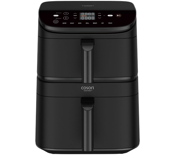 Turbo TowerModułowa frytkownica beztłuszczowaŁatwe, zbilansowane posiłkiKompaktowa konstrukcja, imponująca pojemnośćCOSORI Turbo Tower to frytkownica beztłuszczowa o pojemności 10,8 l, zaprojektowana w smukłej, pionowej formie o wysokości 40,5 cm. Zajmuje o 32% mniej miejsca na blacie niż tradycyjne modele z dwoma koszami, oferując przy tym imponującą pojemność - idealna do każdej kuchni. Gotuj trzy dania na razDzięki dwóm koszom i wygodnemu rusztowi, urządzenie pozwala przygotować cały posiłek - przystawkę, danie główne i deser - w jednym cyklu. To świetna opcja na rodzinne obiady lub szybkie serwowanie różnych dań bez mieszania smaków.Dwa silniki DC - szybko, równomiernie, energooszczędnieKażdy kosz ma własny silnik DC, szybszy od standardowego AC o 28%. Razem z podwójnym systemem grzania zapewniają równomierne gotowanie w temperaturach od 30°C do 230°C - sprawnie i bez kompromisów.7 trybów gotowania w jednym urządzeniuTurbo Tower oferuje aż siedem programów: Pieczenie, Odgrzewanie, Air Fry, Grillowanie, Opiekanie, Wyrastanie i Suszenie. Automatyczna regulacja wentylatora dopasowuje się do trybu, a obsługa sprowadza się do jednego przycisku. Urządzenie może z powodzeniem zastąpić kilka sprzętów kuchennych, takich jak piekarnik, grill oraz suszarka do żywności. Wyrastanie Prędkość wentylatora 1 Suszenie Prędkość wentylatora 2 Pieczenie Prędkość wentylatora 3 Odgrzewanie Prędkość wentylatora 4 Air Fry, Grillowanie, Opiekanie Prędkość wentylatora 5Mniej tłuszczu, ten sam smakTechnologia gorącego powietrza pozwala zmniejszyć użycie oleju nawet o 95%, bez utraty smaku i chrupkości. Mięso, warzywa, ryby czy desery wychodzą równomiernie przyrumienione i soczyste, a kompletne, zbilansowane danie zrobisz w jednej sesji gotowania.Czyszczenie bez wysiłkuDzięki powłoce zapobiegającej przywieraniu wystarczy jedno przetarcie, by usunąć resztki. Wyjmowane części można myć w zmywarce, co znacznie ułatwia sprzątanie po posiłkach. To rozwiązanie dla tych, którzy cenią sobie wygodę.Przepisy i inspiracje w Twoim telefonieDzięki aplikacji VeSync masz zawsze pod ręką zestaw sprawdzonych przepisów. To idealne narzędzie dla wszystkich, którzy lubią gotować z pomysłem - niezależnie od poziomu zaawansowania. Prosta obsługa i przejrzysty układ aplikacji sprawiają, że planowanie posiłków staje się szybkie, wygodne i przyjemne.W zestawieW opakowaniu znajdziesz dwa talerze Crisper, ruszt do gotowania na dwóch poziomach, instrukcję obsługi oraz pomoc przy pierwszym uruchomieniu.