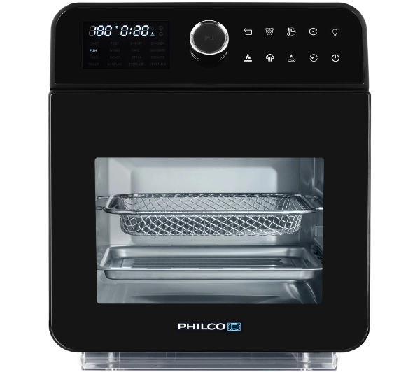 - Funkcje dodatkowe: antypoślizgowe nóżki, kosz obrotowy , możliwość smażenia, opiekania, pieczenia, prażenia i grillowania, okienko do poglądu, podświetlenie wnętrza, timer, wskaźnik zasilania, wyświetlacz LCD