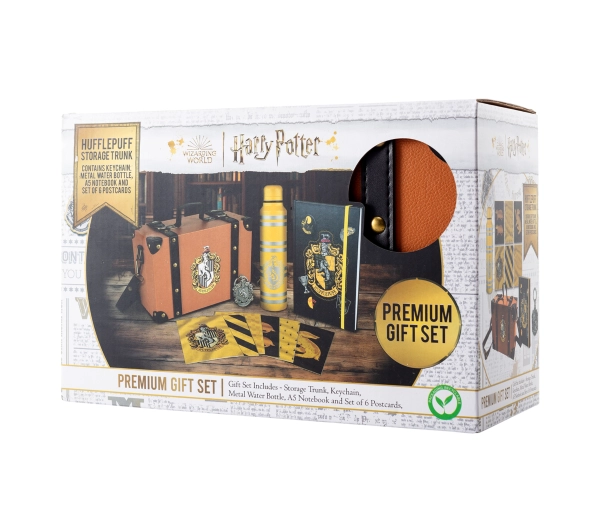 Opis: To wyjątkowa kolekcja inspirowana domem Hufflepuff, zawierająca elegancki notatnik A5, metalową butelkę na wodę, brelok i zestaw pocztówek – wszystko zapakowane w stylową skrzynię z regulowanym paskiem na ramię.
