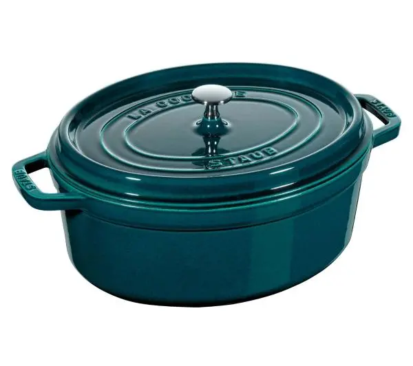 <p>ŻELIWO I CERAMIKA STWORZONE W ALZACJI.PODZIWIANE NA CAŁYM ŚWIECIE.</p><p>GARNEK ŻELIWNY OWALNY STAUB</p><h2>GARNEK ŻELIWNY OWALNY STAUB</h2><p>Owalny, żeliwny garnek Staub to idealne naczynie do duszenia, pieczenia i gotowania pysznych dań. Dzięki specjalnej pokrywce potrawa jest doskonale nawilżona a jej smak niepowtarzalny!</p><p>Duże, wygodne uchwyty po jego obu stronach oraz duża gałka znajdująca się na pokrywce umożliwiają mocny i pewny chwyt, nawet w rękawicach kuchennych. Można go stosować na wszystkich źródłach ciepła, w tym na indukcji oraz w piekarniku.</p><p>Garnek żeliwny Staub, dostępny w różnych wariantach kolorystycznych, rozmiarach i pojemnościach to idealne naczynie do przygotowywania i serwowania potraw.</p><h2>WYMIARY</h2><table> <tbody> <tr> <td>Średnica:</td> <td>31 cm</td> </tr> <tr> <td>Średnica dna:</td> <td>25 cm</td> </tr> <tr> <td>Pojemność:</td> <td>5.5 ltr</td> </tr> <tr> <td>Długość:</td> <td>37.5 cm</td> </tr> <tr> <td>Szerokość:</td> <td>25 cm</td> </tr> <tr> <td>Wysokość:</td> <td>16.7 cm</td> </tr> <tr> <td>Wysokość (bez pokrywki):</td> <td>11.8 cm</td> </tr> <tr> <td>Masa:</td> <td>6 kg</td> </tr> </tbody></table><p>idealny doserwowania potraw</p><p>duże, wygodneuchwyty</p><h2>POKRYWKA Z SYSTEMEM DESZCZOWNICY</h2><p>Olbrzymią zaletą żeliwnego garnka Staub jest specjalnie opracowana pokrywa z systemem deszczownicy zapewniająca idealne nawilżenie potrawy. Para wodna znajdująca się w garnku nie spływa po jego ściankach - dzięki wypustkom znajdującym się na spodzie pokrywki skrapla się wprost na przygotowywaną potrawę. Zachowujemy przy tym maksimum smaku, aromatu i estetyki dania.</p><p>Specjalna struktura aromatycznego deszczu zapewniająca ciągły cykl nawilżenia i naturalne samokonserwowanie żywności.</p><h2>NIEPRZYWIERAJĄCA POWŁOKA NON-STICK</h2><p>Wewnętrzna powłoka nieprzywierająca sprawia, że jedzenie nie przywiera a garnek jest łatwy w czyszczeniu. Kolorowa, zewnętrzna emalia zapewnia trwałość oraz nadaje naczyniu niepowtarzalny wygląd.</p><h2>GARNEK ŻELIWNY OWALNY STAUB</h2><p>Wszechstronne zastosowanie - można w nim dusić, gotować lub piec potrawy</p><p>Specjalnie opracowana deszczownica w pokrywce zapewnia ciągłe nawilżenie potrawy</p><p>Idealny do powolnego gotowania mięsa, ryb czy warzyw by wydobyć ich niezwykłą soczystość i delikatność</p><p>Nadaje się do wszystkich rodzajów płyt grzewczych, w tym również indukcyjnych</p><p>Można używać w piekarniku</p><p>30 lat gwarancji</p><h2>SPECYFIKACJA</h2><p>Przeznaczenie:Do gotowania</p><p>Powłoka non-stick:Tak</p><p>Uchwyt:Żeliwny</p><p>Rodzaj powłoki:Emaliowana</p><p>Odporność termiczna:240°C</p><p>Materiał:Żeliwo</p><p>Przystosowanie do kuchenek:</p><p>Przystosowanie do piekarnika: TAK</p><p>Thermopoint</p><p>Nie</p><p>Czyszczenie przy użyciu zmywarek</p><p>Tak</p><p>Regulacja pary</p><p>Brak</p><h2>LINIA: LA COCOTTE</h2>