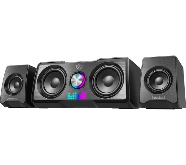 W zestawie znajdują się 2 głośniki oraz subwoofer (głośnik odpowiedzialny za niskie dźwięki). Rozmieść je po obu stronach komputera i zanurz się w pełnym, przestrzennym dźwięku najwyższej jakości!
