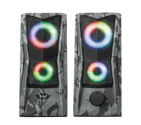 TrustGXT 606 Javv – podświetlane głośniki 2.0 WATT MOCY JACK 3.5MM I USB 16.8 MLN KOLORÓW WYTRZYMAŁA OBUDOWAKompaktowa siłaTrust GXT 606 Javv to podświetlane głośniki 2.0, które wyróżniają się przede wszystkim swoim oryginalnym designem w szare camo. Ciesz się ze wspaniałego dźwięku, który mogą zapewnić te głośniki. Nie będziesz musiał już siedzieć w niewygodnych słuchawkach. Podłącz kabel USB i AUX do swojego komputera i zacznij przygodę.Nowa przygodaPrawdziwy powiew świeżości dla twojego biurka. Niesamowity szary design w camo oraz podświetlenie to prawdziwy raj dla twoich oczu. Wykończone metalowym grillem dostają dodatkowej zimności oraz wytrzymałości.