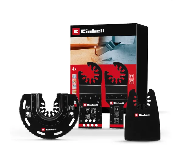 <ul> <li>4-częściowy zestaw akcesoriów do narzędzi wielofunkcyjnych Einhell</li> <li>Bimetalowe ostrze do cięć wgłębnych (34 mm, 18 TPI)</li> <li>Bimetalowe ostrze półokrągłe (średnica 87 mm, 18 TPI)</li> <li>Ostrze do cięć wgłębnych CrV (20 mm, 18 TPI)</li> <li>Elastyczny skrobak (szerokość 50 mm)</li></ul>