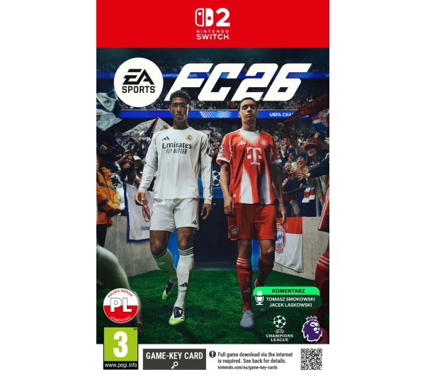 <h2>EA SPORTS FC 26</h2> EA SPORTS FC 26 to kolejna odsłona uwielbianej na całym świecie serii piłkarskiej. Wskocz na wirtualną murawę, aby spróbować swoich sił w grze solo, połączyć siły ze znajomymi z Klubu lub wziąć udział w menedżerskich wyzwaniach na żywo. Jeszcze bardziej realistyczna rozgrywka dzięki licznym ulepszeniom inspirowanym uwagami graczy Nowe ustawienia dostosowane do dwóch różnych rodzajów rozgrywki - autentycznej i kompetytywnej Stwórz i rozwijaj swojego zawodnika, korzystając z archetypów opartych na wielkich nazwiskach ze świata piłki Football Ultimate Team z turniejami i wydarzeniami na żywo oferuje nowe sposoby rywalizacji Podejmij wyzwanie jako menedżer drużyny i zobacz, jak poradzisz sobie w różnych scenariuszach Graj w pojedynkę lub połącz siły ze znajomymi w Klubach i ciesz się ekscytującymi turniejami przez cały sezon Przeżyj od nowa ikoniczne rozgrywki i doświadcz niespotykanej autentyczności z ponad 20 000 zawodników <h2>Poznaj grę na Nintendo Switch EA SPORTS FC 26</h2> Rozbudowana rozgrywka EA SPORTS FC 26 przynosi istotne nowości dla fanów kultowej serii gier o tematyce piłkarskiej. Twórcy wzięli pod uwagę głosy społeczności FC i przebudowali rozgrywkę, korzystając z ich sugestii. Dzięki wprowadzonym ulepszeniom potyczki na murawie są jeszcze bardziej wciągające i realistyczne. W tej odsłonie doświadczysz między innymi bardziej responsywnego dryblingu, zwiększonej dynamiki poruszania się zawodników i inteligentniejszej reakcji bramkarzy. Graj na swój sposób W grze na Nintendo Switch EA SPORTS FC 26 możesz wybrać jeden z dwóch zestawów ustawień, które zostały zaprojektowane na potrzeby dwóch różnych trybów rozgrywki. Pierwszy z nich jest dostrojony do meczów 1 na 1 w Ultimate Team i klubach. Jeśli lubisz zaciętą rywalizację, niewątpliwie docenisz przyspieszone podania i zwiększoną kontrolę nad zawodnikiem. Zależy Ci na jak najbardziej autentycznej grze? Daj się porwać realistycznym piłkarskim doświadczeniom w trybie Kariery. Stań się mistrzem piłki Zostań gwiazdą w świecie piłkarskim i wyróżnij się na wirtualnym boisku. EA SPORTS FC 26 oferuje szerokie możliwości personalizacji własnego zawodnika. W tej odsłonie znajdziesz archetypy inspirowane znanymi piłkarzami. Każdy z nich odznacza się unikalnym zestawem cech i umiejętności, które możesz rozwijać przez cały sezon. W miarę zdobywania doświadczenia będziesz zdobywać bonusy archetypowe, dzięki którym Twój zawodnik wykształci swój niepowtarzalny styl gry. Wciągająca rywalizacja EA SPORTS FC 26 otwiera przed graczami nowe sposoby rywalizacji w Football Ultimate Team. Podczas turniejów możesz wziąć udział w maksymalnie czterech rundach piłkarskich rozgrywanych systemem pucharowym. W grze pojawiają się też wydarzenia na żywo z ciekawymi wyzwaniami tematycznymi i zawartością dostępną tylko przez ograniczony czas w trakcie sezonu. Zostań menedżerem Spróbuj swoich sił nie tylko jako zawodnik, ale także menedżer drużyny piłkarskiej. Gra na Nintendo Switch EA SPORTS FC 26 oferuje nowe wyzwania menedżerskie na żywo, które są dostępne przez cały sezon. Prezentowane w trakcie rozgrywki scenariusze odzwierciedlają prawdziwe wydarzenia ze świata futbolu i fikcyjne wątki fabularne. Zdobywaj nagrody przez cały rok Ciesz się emocjonującą rozgrywką przez cały sezon. Graj solo lub skompletuj swoją drużynę, aby wziąć udział w turniejach eliminacyjnych i zdobywać nagrody. Nowy, ulepszony system „Bądź bramkarzem” pozwala graczowi stać się ostatnią linią obrony w Klubach Rush. EA SPORTS FC 26 umożliwia grę z 3 różnymi klubami jednocześnie, abyś mógł doświadczyć jeszcze więcej przyjemności z rywalizacji na murawie. Dzięki dodatkowym celom w trakcie meczu zyskasz nowe wrażenia. Realistyczna rozgrywka Poczuj emocje tak silne, jak podczas meczu w realu. Twórcy EA SPORTS FC 26 zadbali o to, aby rozgrywka była jak najbardziej autentyczna. W grze pojawiło się więcej niż 20 000 zawodników z przeszło 750 klubów i reprezentacji narodowych na ponad 120 stadionach i w 35 ligach. Co więcej, ulepszona oprawa graficzna z realistycznym oświetleniem stadionów, wyraźnymi detalami murawy i wiernym odwzorowaniem warunków pogodowych zwiększa efekt zanurzenia w akcji. <h2>Zawartość opakowania EA Sports FC 26</h2> W opakowaniu Klucz dostępu do gry Electronic Arts – marka godna zaufania Znacząca marka Druga co do wielkości firma zajmująca się grami Ogromny wkład w rozwój rynku gier Marka powstała w 1982 roku Wydawca popularnych tytułów Między innymi serie Battlefield, The Sims, NFS, Dragon Age czy Mass Effect