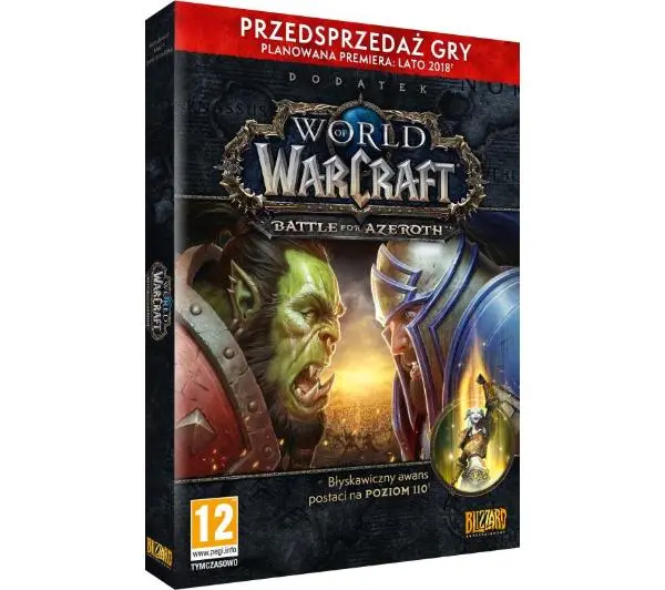 DODATEK BATTLE FOR AZEROTH DEBIUTUJE TEGO LATA KUP W PRZEDSPRZEDAŻY JUŻ TERAZ I PRZYGOTUJ SIĘ NA WOJNĘZwerbuj cztery nowe grywalne sprzymierzone rasy , które dołączą do walki w nadchodzącym dodatku do World of Warcraft Błyskawicznie awansuj wybraną postać z Hordy lub Przymierza na poziom 110!Dodatek Battle for Azeroth wprowadza do World of Warcraft zupełnie nowy wymiar konfliktu między Hordą a Przymierzem. Obie frakcje dostaną nowy kontynent do eksploracji. Pojawią się również nowości w rozgrywce: rasy sprzymierzone, losowo generowane Wyspiarskie wyprawy oraz wielkie starcia na Frontach Wojennych – powiedział Mike Morhaime. – Nieważne, którą stronę konfliktu wybiorą gracze: kiedy dodatek debiutuje tego lata, ich lojalność wobec danej frakcje zostanie poddana poważnej próbie.Gracze, którzy zakupią w przedsprzedaży Battle for Azeroth, mogą rozpocząć wysiłki na rzecz zwerbowania przedstawicieli czterech spośród ras sprzymierzonych wprowadzonych w tym dodatku. Reprezentują oni ludy, u boku których gracze walczyli na Zniszczonych Wyspach i na Argusie w ostatnim dodatku do gry, Legion™. Aby zaskarbić sobie ich szacunek, należy wykonywać zadania i zdobywać reputację. Gdy to się powiedzie, gracze odblokują możliwość tworzenia postaci wywodzących się z tych ras i wzięcia udziału w nowych przygodach w Azeroth. Bohaterowie Przymierza mogą włączyć w szeregi swojej frakcji mroczne elfy Pustki i pełnych męstwa Świetlistych draenei. Z kolei gracze lojalni wobec Hordy staną ramię w ramię z pradawnymi Dziećmi Nocy i szlachetnymi taurenami z Wysokiej Góry. Po premierze dodatku możliwe będzie rekrutowanie kolejnych ras sprzymierzonych.Zakup w przedsprzedaży dodatku Battle for Azeroth zapewnia też możliwość błyskawicznego awansu wybranej postaci na poziom 110. Dzięki temu gracze mogą wkroczyć na front wielkiej bitwy w pełni gotowi do walki. Po premierze dodatku gracze wyruszą po wsparcie do żeglarskiego królestwa Kul Tiras i do trolli z Imperium Zandalariańskiego. Powalczą też o kontrolę nad strategicznie umiejscowionym Burzogrodem w ramach dwudziestoosobowej kooperacyjnej misji na Froncie Wojennym oraz wezmą również udział w Wyspiarskich wyprawach, wojując w niewielkich grupach o zasoby rozsiane po zdradliwym, nieodkrytym terenie.<h3>World of Warcraft: Battle for Azeroth zawiera nowe funkcje i zawartość, dzięki którym gracze wystawią na próbę swoje zaangażowanie i niezłomność. Oto, jakie wyzwania czekają w nadchodzącym dodatku:</h3><ul> <li>Odkryj dwie legendarne krainy. Jako czempion Hordy wyruszysz z misją do Imperium Zandalariańskiego, by przekonać trolle do udzielenia wsparcia ich frakcji na morzach i oceanach Azeroth. Jako obrońca Przymierza udasz się do żeglarskiego królestwa Kul Tiras – ojczyzny Jainy Proudmoore – aby zachęcić mieszkańców do walki o wspólny cel.</li> <li>Zwerbuj sprzymierzone rasy. Rozpocznij przygodę jako przedstawiciel jednej z nowych, grywalnych sprzymierzonych ras. Każdą z nich cechują wyjątkowe zdolności. Zaskarb sobie szacunek taurenów z Wysokiej Góry, elfów Pustki, Czarnorytnych krasnoludów i innych, aby stworzyć postacie wywodzące się z tych ras i zasilić nimi szeregi swojej frakcji.</li> <li>Złup wyspy Wielkiego Morza. Ruszaj na poszukiwanie przygody w Wyspiarskich wyprawach. Staw czoła coraz to nowym, zmieniającym się przeciwnikom oraz rodzajom terenu i realizuj nowe cele. Wraz z towarzyszami w trzyosobowych grupach zmierzycie się z innymi najeźdźcami lub wrogimi graczami, aby zagarnąć dla siebie zasoby wysp i wzmocnić pozycję swojej frakcji w wojnie.</li> <li>Ruszaj na Front Wojenny. Ruszaj na pierwszą linię i weź udział w zakrojonych na wielką skalę, rozgrywanych w dwudziestoosobowych grupach kooperacyjnych misjach na Frontach Wojennych, aby przejąć kontrolę nad jednym ze strategicznych punktów kluczowych dla przebiegu wojny. Gromadź zasoby, by budować potęgę swojej frakcji i poprowadź swoje oddziały ku zwycięstwu w nowych, inspirowanych strategicznymi korzeniami serii Warcraft bataliach PvE.</li> <li>Nasyć swój pancerz potęgą tytanów. Wyrusz na poszukiwania azerytu – tajemniczego i bezcennego zasobu, który pojawił się na świecie po inwazji Płonącego Legionu. Nasyć Serce Azeroth – legendarny amulet powierzony bohaterom przez Magniego Miedziobrodego – mocą tego minerału, aby spersonalizować swój pancerz i nadać mu nowe cechy i właściwości.</li> <li>Walcz do poziomu 120: Odkryj źródło splugawienia Krwawego Boga w Podzgnilisku (Underrot), poznaj sekrety zapomnianej krypty tytanów i wymknij się z kontrolowanego przez drustów Królestwa Umarłych. Wykonując zadania, możesz awansować o 10 kolejnych poziomów. Następnie rośnij w siłę dzięki zadaniom publicznym, rajdom, podziemiom i wielu innym.</li></ul>Data premiery dodatku World of Warcraft: Battle of Azeroth: LATO 2018Data premiery preordera World of Warcraft: Battle of Azeroth: 28.02.2018*produkt nie zawiera płyty z grą*produkt nie zawiera abonamentu, należy go zakupić oddzielnie (abonament wymagany do przeprowadzenia rozgrywki)