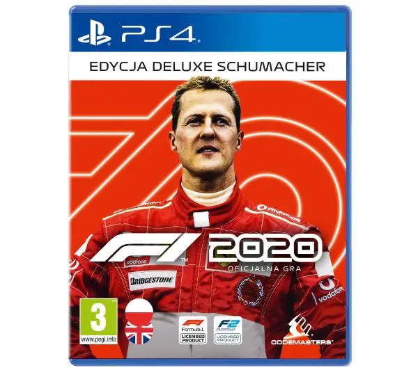 Świętuj z nami legendarną karierę Michaela Schumachera i ścigaj się jego czterema kultowymi bolidami, a także otrzymaj ekskluzywną zawartość, w tym specjalne malowanie bolidu, kaski, stroje oraz celebrację na podium. Możesz nawet wziąć udział w trybie kariery jako sam Michael Schumacher!F1® 2020 Edycja Deluxe Schumacher zawiera podstawową, pełną grę F1® 2020, wszystkie dodatki z Edycji Siedemdziesięciolecia (malowanie bolidu, celebrację na podium, kask, kombinezon, rękawice, buty oraz plakietkę gracza), a ponadto:- Cztery kultowe samochody Michaela Schumachera: • 1991 Jordan 191 • 1994 Benetton B194 • 1995 Benetton B195 • 2000 Ferrari F1-2000- Ekskluzywny model postaci Michaela Schumachera oraz specjalne stroje, kaski i celebrację na podium.- Wyjątkowe malowania samochodu, zainspirowane postacią Michaela Schumachera.F1® 2020 to najpełniejsza gra w serii, pozwalająca rywalizować z najlepszymi kierowcami świata. Po raz pierwszy w historii gracz może w niej zarządzać własnym zespołem - tworząc dowolnego kierowcę, wybierając sponsorów i producentów silnika, zatrudniając innych i startując w zawodach oraz pnąc się coraz wyżej w rankingach. Dostosuj do swoich wymagań tryb dziesięcioletniej kariery z możliwościami wyboru startu także w zawodach F2™ (z różnymi długościami sezonów), co pozwoli na ekscytującą zabawę przez wiele sezonów, a więc dziesiątki godzin w realnym świecie. Dodanie trybu rywalizacji na podzielonym ekranie, asysty sterowania oraz innych udogodnień pozwala natomiast na zabawę z przyjacielem, nawet, jeśli jest zupełnym nowicjuszem w temacie wyścigów samochodowych czy Formuły 1. F1® 2020 zawierać będzie wszystkie oficjalne zespoły, kierowców i 22 tory obecne w oficjalnym kalendarzu tegorocznego sezonu, w tym dwa nowe: Hanoi Circuit (Wietnam) oraz Circuit Zandvoort (Niderlandy). Łącze internetowe jest wymagane, aby uzyskać za darmo dostęp do finalnych modeli bolidów na sezon F1® 2020 oraz zawartości F2™ 2020 po premierze gry. - OFICJALNA GRA 2020 FORMULA ONE WORLD CHAMPIONSHIP™- NOWOŚĆ - Mój Zespół, tryb tworzenia własnej drużyny. Stwórz kierowcę, wybierz sponsorów, dostawcę silnika, zatrudnij drugiego kierowcę i ruszaj! Buduj z czasem nowe obiekty w siedzibie zespołu i zarządzaj pnącą się w rankingach drużyną.- NOWOŚĆ - dwa nowe tory, Hanoi Circuit oraz Circuit Zandvoort.- NOWOŚĆ – tryb rywalizacji na podzielonym ekranie dla dwóch graczy.- NOWOŚĆ - szereg udogodnień dla nowicjuszy, aby ułatwić im zabawę i wdrożenie się w mechaniki gry.- NOWOŚĆ - wybór długości sezonu, z 10, 16 lub 22 wyścigami.- Wszystkie oficjalne zespoły, kierowcy i tory z oficjalnych Mistrzostw Świata.- Doceniany przez fanów oraz media tryb dziesięcioletniej kariery.- Formula 2™, uznany poligon treningowy dla F1 od teraz dostępny z opcjami pełnego lub połowy sezonu oraz zawartością sezonów z 2019 i 2020*.- 16 klasycznych bolidów z lat 1988 do 2010.- Esport - strefa kwalifikacji sieciowych, najnowszych wieści, możliwość oglądania wyścigów F1® Esports Challenger oraz Pro Series, a także szansa na wzięcie udziału w oficjalnych wydarzeniach F1® wraz z prawdziwymi kierowcami.- Więcej trybów: Wyścig na Czas, Grand Prix™, mistrzostwa oraz zapisywalne powtórki zwycięstw.- Wyścigi w sieci: zarówno w ramach rankingów jak i bez, ligi, cotygodniowe wydarzenia i unikalne malowania samochodów do zdobycia.* Łącze internetowe wymagane, aby uzyskać za darmo dostęp do finalnych modeli bolidów na sezon F1® 2020 oraz zawartości F2™ 2020 po premierze gry.