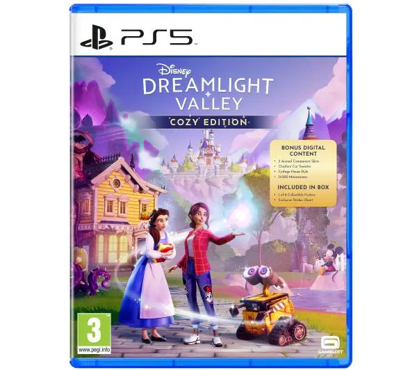 Disney Dreamlight Valley: Cozy Edition zawiera: <ul> <li>Wersja Standardowa gry Disney Dreamlight Valley</li> <li>1 z 6 ekskluzywnych plakatów dwustronnych (do wyczerpania zapasów).</li> <li>Ekskluzywne naklejki Disney Dreamlight Valley (do wyczerpania zapasów).</li> <li>Ekskluzywny Sweter Cyfrowy z Wizerunkiem Kota Cheshire (noszony przedmiot w grze dla twojego awatara).</li> <li>5 Ekskluzywne Skórki Towarzysza Zwierzęcia (skórki stworzeń w grze).</li> <li>Domek Wiejski (skórka domu w grze).</li> <li>14 500 księżycowych kamieni (waluta w grze).</li></ul>