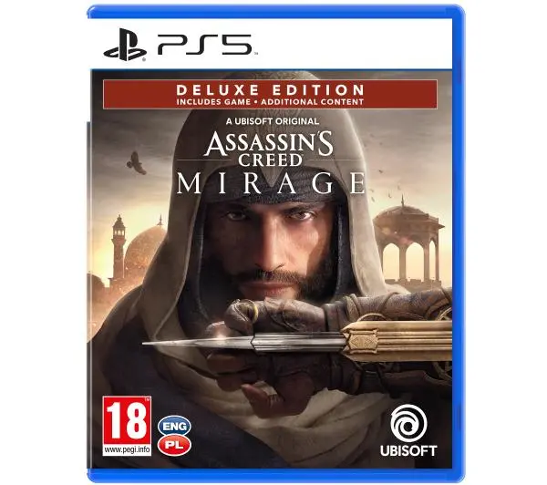 ZAWARTOŚĆ DODATKOWA: Kopia edycji deluxe Assassin's Creed® Mirage, w tym pełna wersja gry oraz zawartość cyfrowa:- Edycja deluxe: strój inspirowany grą Prince of Persia, skórki dla orła oraz wierzchowca, broń i nie tylko!- Zawartość bonusowa**: cyfrowy artbook i cyfrowa ścieżka dźwiękowa. *Oferta może ulec zmianie. Więcej informacji na stronie ubisoft.com/help. Wymagane połączenie z Internetem. Cyfrowy artbook oraz ścieżka dźwiękowa dostępne do pobrania lub streamowania na oficjalnej stronie assassinscreed.com**Wymagane połączenie z Internetem. Cyfrowy artbook oraz ścieżka dźwiękowa będą dostępne na oficjalnej stronie Assassin's Creed od chwili premiery gry.